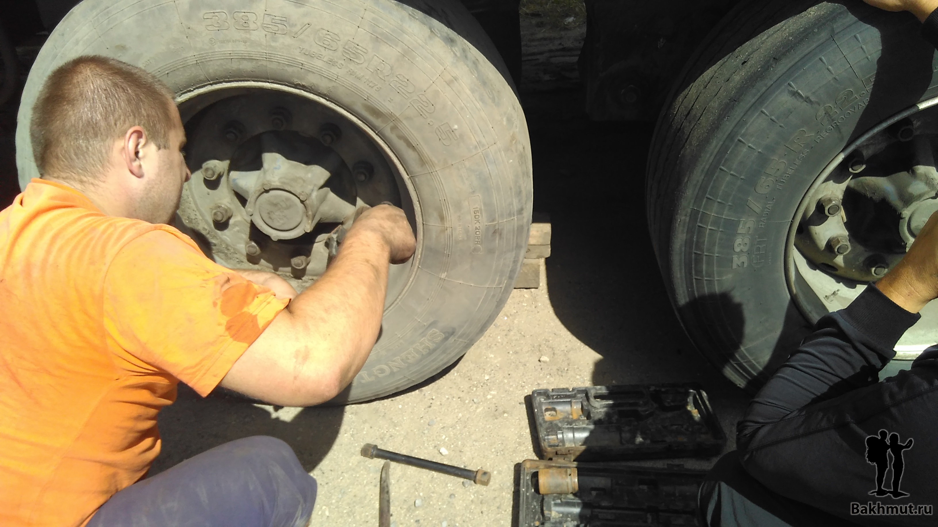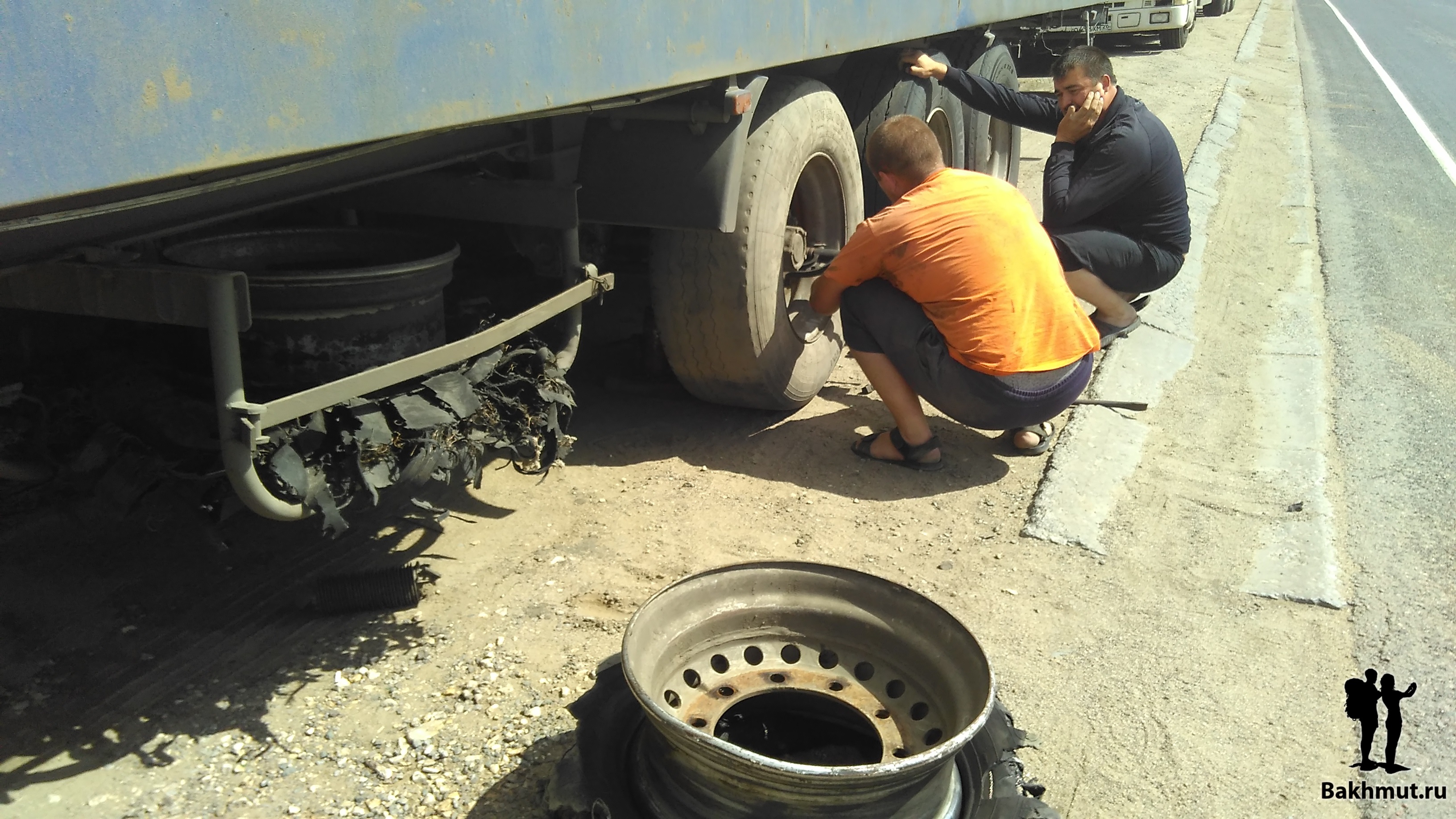 Теперь про колесо. Запасок не было, а Виктор проспал вспышку когда на противоположной стороне дороги, там, где находилась кафешка и стоянка для большегрузов, было много машин. Мы стояли на пустой обочине и мне пришлось переходить дорогу, когда я ходил в кафешку за водой. После просьбы последовал стандартный ответ про техническую воду, но, когда я сказал, что заплачу и мне нужная вода для чая, мне налили полуторалитровую бутылку просто так. Виктор проснулся и тоже пошёл на другую сторону дороги. Просить помощи у тех, кто остался на стоянке. Однако ему повезло гораздо меньше, чем нам. Никто не хотел помогать брату-дальнобойщику. Его не было так долго, что я уж было подумал, а не уехал ли он куда-нибудь за помощью и не пора ли нам встать на обочину и последовать его примеру? Ведь о чём-то подобном мы говорили вчера. Но нас так просто не напугаешь! Виктора я заметил издалека – он катил здоровенное колесо в компании не менее здоровенного собрата по профессии. К сожалению, я не помню как зовут человека одолжившего нам запаску и согласившегося проехать с нами до ближайшей шиномонтажки, где мы смогли бы вернуть её. Вот он, присел рядом с Виктором, меняющим колесо: