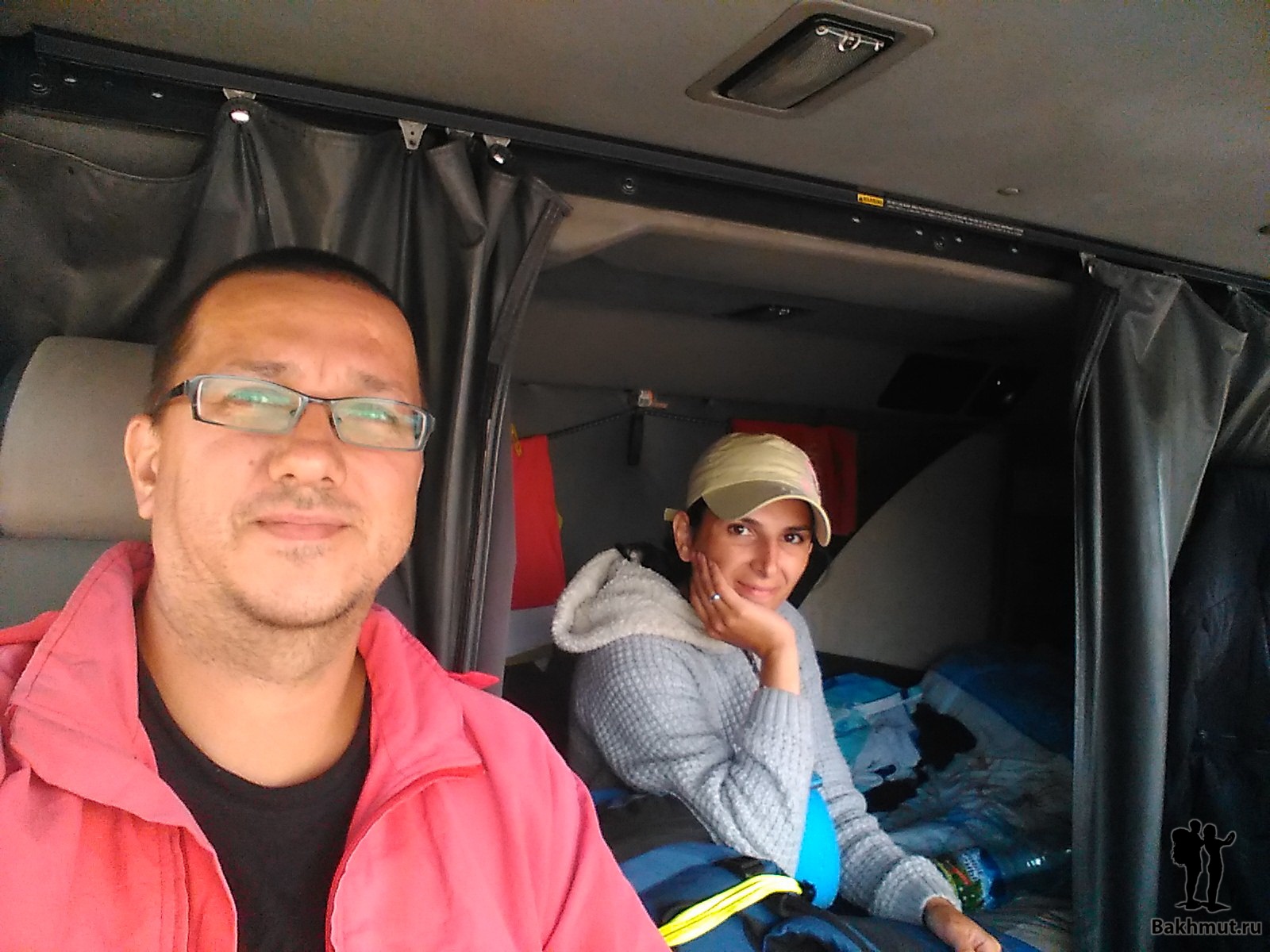 Вот так и мы, проснувшись утром 12 июля, надеялись на лучшее и на «дальнобойное братство» которого, как позже мы не раз убеждались, вовсе и нет. Конечно, мир не без добрых людей, но в основной своей массе среди дальнобойщиков всё точно так же, как и среди других людей. Встали раньше Виктора, выползли из палатки – на улице не слабый такой ветер, прохладно. Пока светало, сделали все утренние дела и попили кофе, перекусив аварийным рациончиком. Пока суть да дело, решили использовать степной ветер и просушиться. Повытаскивали всё, что промокло во вчерашнем ливне и верёвками закрепили по периметру палатки. Поэтому, когда мы сменили колесо, всё благополучно высохло. Ветер действительно дул очень сильный – на фотографии видно, как мы одеты. Но Виктор — парень закалённый, поэтому в майке 🙂