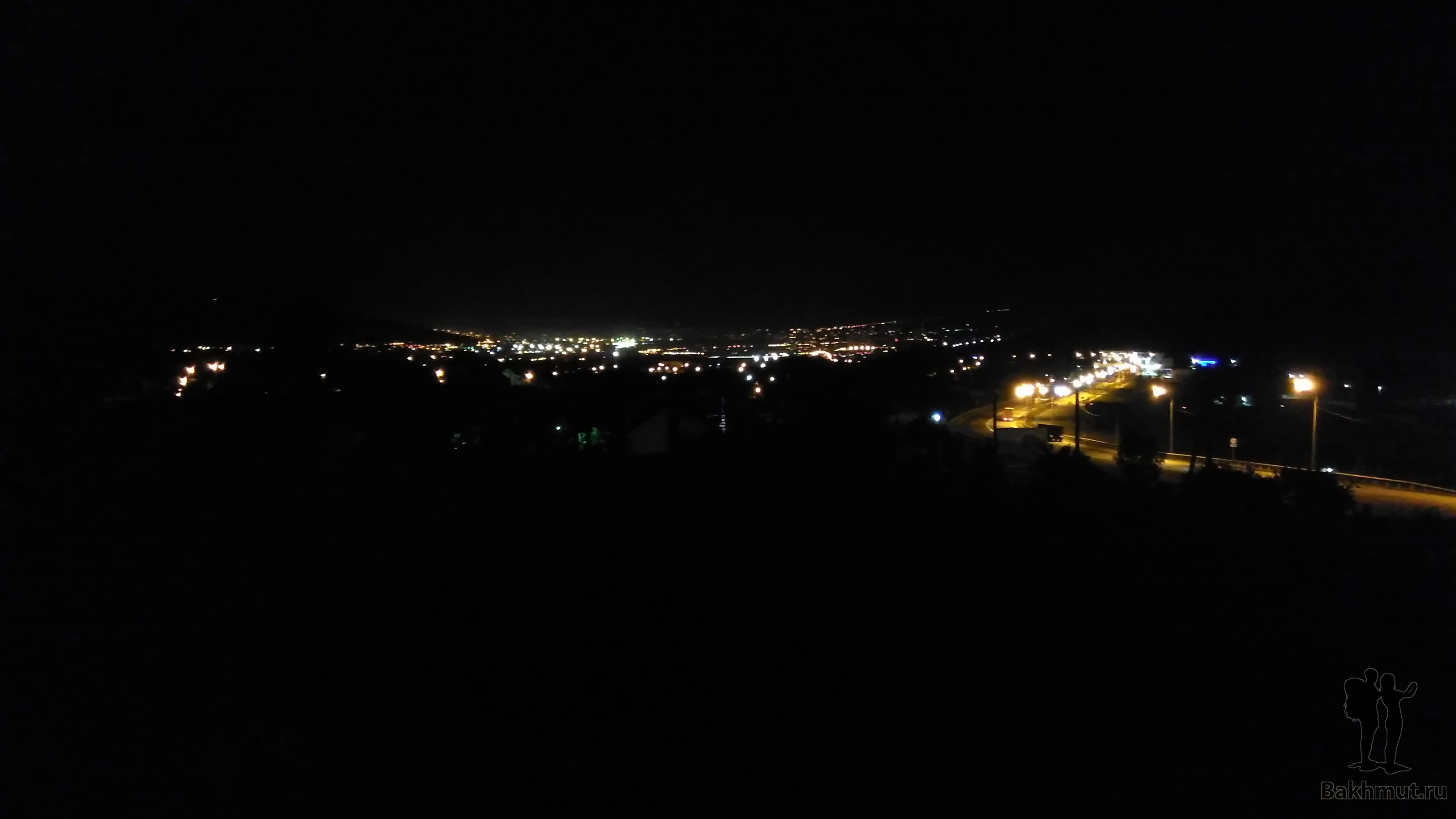Конечно, с нас вновь взяли деньги «за багаж» когда мы выходили. Пройдя немного пешком, мы оказались на трассе, возле милицейского поста. Постояли, безуспешно поголосовали и решили двигаться подальше вверх, от поста. В этот раз мы сразу перешли на другую сторону дороги, дабы не искушать владельцев полосатых палочек. Прошли, пока поднимались, огромную стоянку, где отстаивались, в ожидании разгрузки, фуры с зерном – их невероятное количество мы встречали по дороге. Сразу за стоянкой, на вершине горы, был пропускной пункт, где взвешивали эти грузовики. Здесь мы перешли дорогу обратно и стали ловить попутку. Место было оживлённое, как ни как выезд из города, но нас никто не подобрал. Простояв до темноты, мы, набросив на плечи рюкзаки, поднялись по грунтовой дороге в гору. В отсвете городских огней нашли подходящее место для «домика» и устроились на ночлег. Вид вновь оказался шикарным – перед нами расстилался весь город. Тут мы и заснули, предварительно выпив чаю со вкусным аварийным рациончиком. Спали хорошо, до самого утра. Над славным городом Новороссийском.